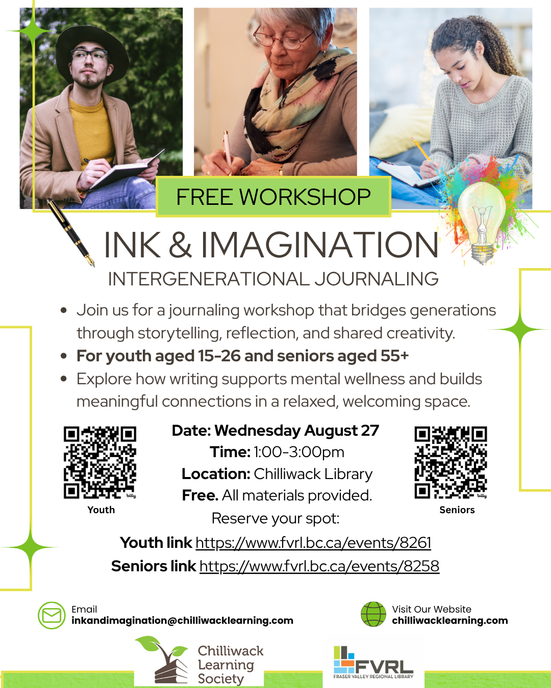 Join us for a journaling workshop that brings generations together through storytelling, reflection and shared creativity. Designed for youth aged 15 to 26 and seniors aged 55 and up, this free event explores how writing supports mental wellness and connection in a relaxed, welcoming space. All materials are provided.