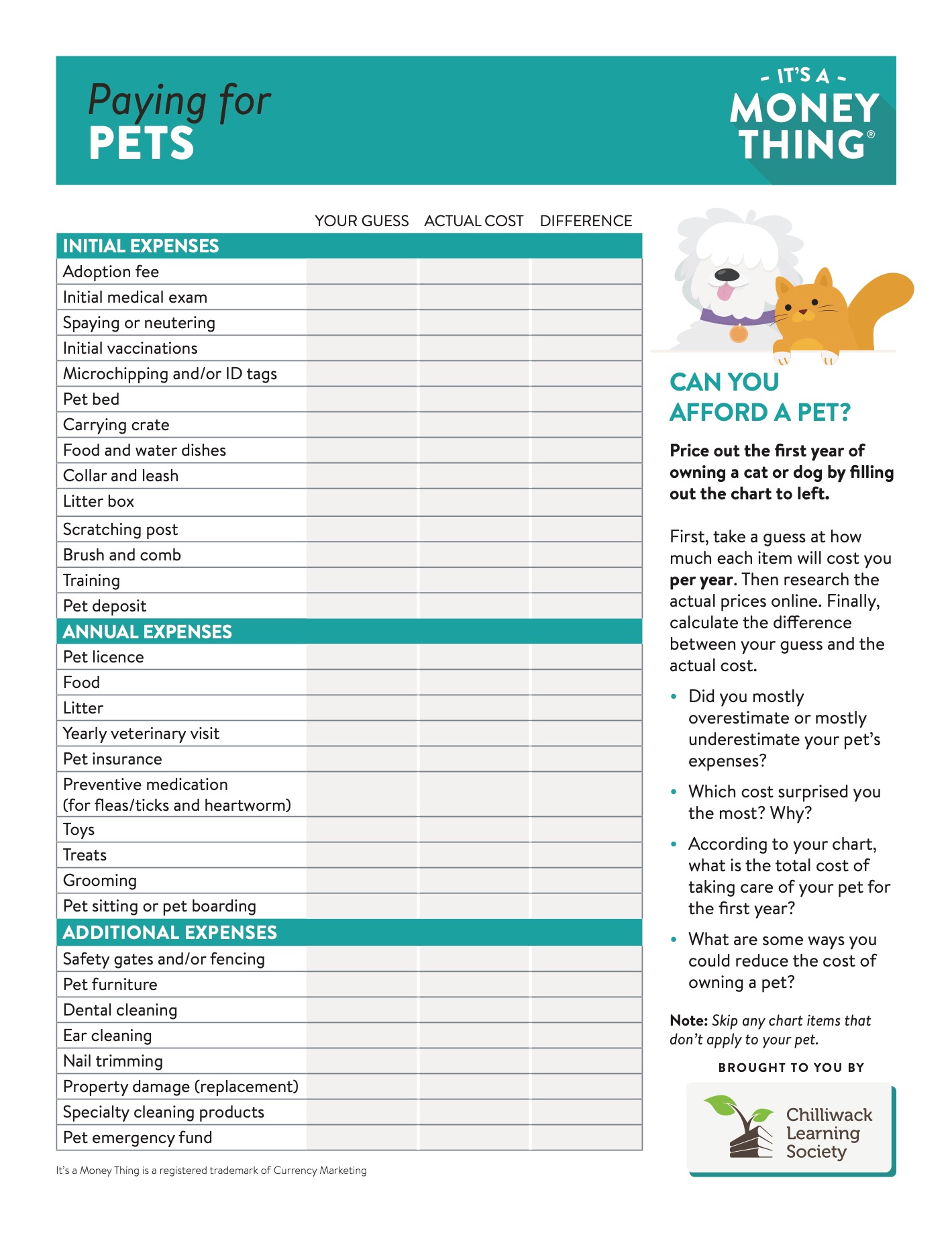 Like walking the dog or scooping out the litter box, budgeting is a part of basic pet care. If you’re thinking about getting a new pet, start by taking a look at your finances. You want to ensure that you can provide for your pet’s regular needs and that you have the ability to respond to emergencies. Searching for pet expense worksheets online is a good starting point and will provide rough estimates for things like adoption fees, food, medicine, supplies and pet services.