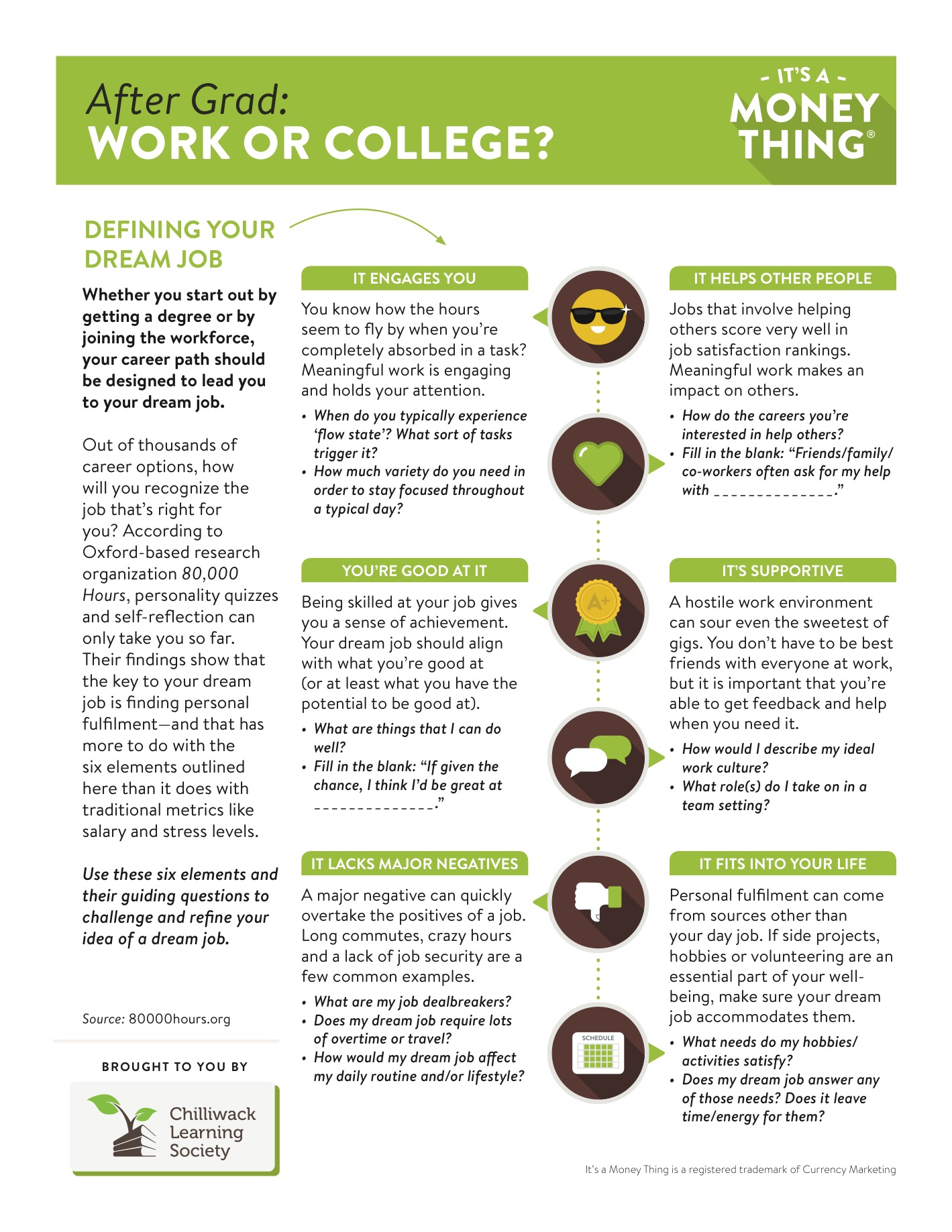 This is a great exercise to get the wheels turning and to brainstorm some options. Pick up a college course catalogue (or scroll through a PDF version online) and highlight any degrees and courses that sound interesting to you. Don’t overthink it—the logistics will come later. Just use the catalogue as an opportunity to see what you naturally gravitate toward. It doesn’t matter whether or not you plan to actually attend that particular school—or any school, for that matter. Were the courses you selected aligned with your interests? Were there any surprises on the list? Generate some potential job titles from the areas of study you highlighted and see if that generates new leads in your career search. If you’re feeling especially inspired, reach out to professors or department heads with any questions you have about the field.