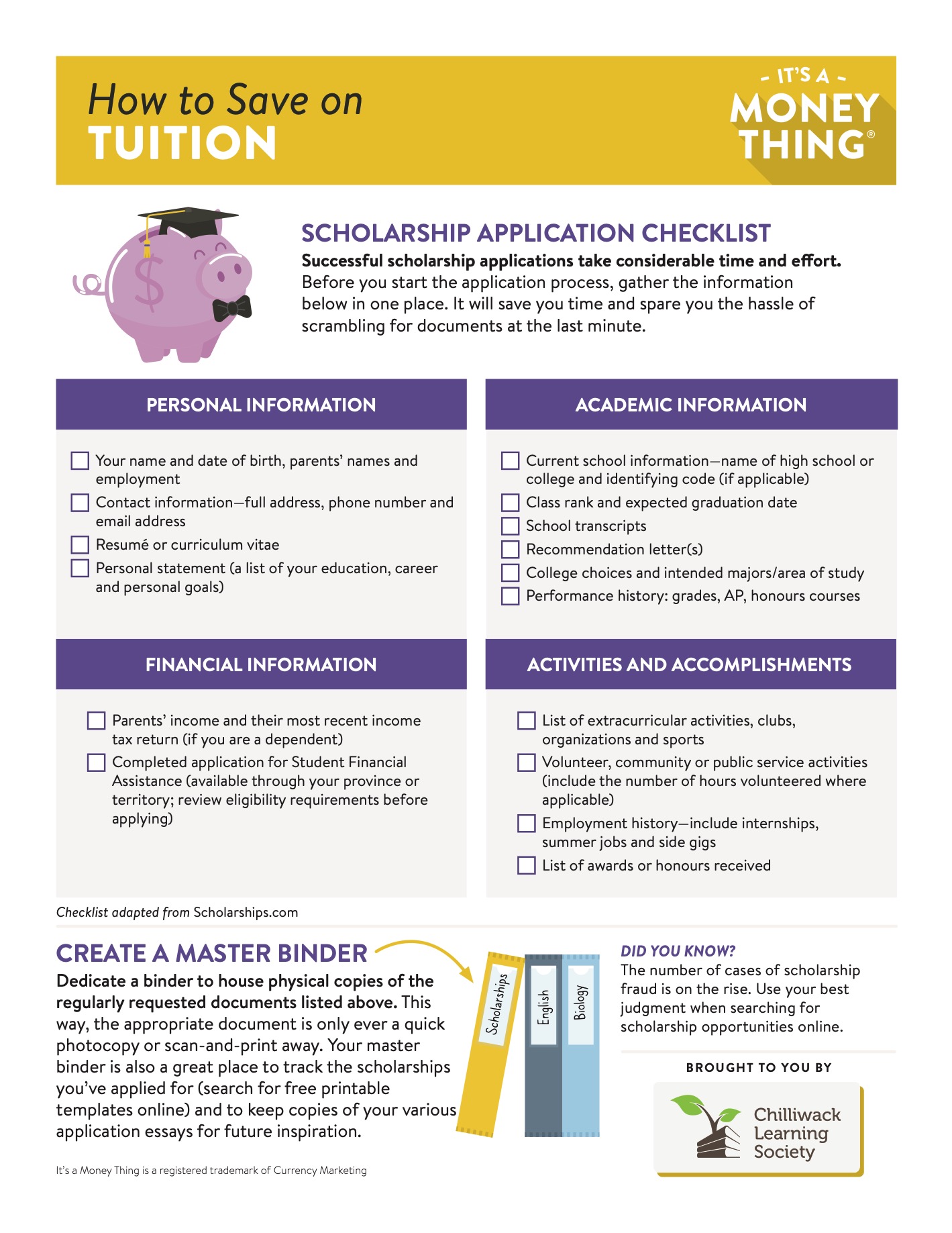 To save yourself the trouble of scrambling for documents at the last minute, dedicate a binder to housing physical copies of regularly requested documents (report cards, transcripts, student ID numbers, awards/certificates, letters of recommendation, parents’ tax returns, etc.). This way, the appropriate document is only ever a quick photocopy or scan-and-print away. The master binder is also a great place to keep a list of scholarships you’ve already applied for, as well as a calendar with upcoming application due dates.