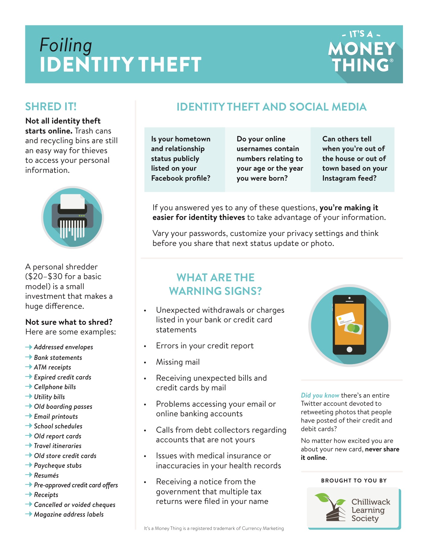 - Get into the habit of shredding things before throwing them out, especially things like bank statements, expired credit cards, utility bills, cellphone bills, paycheque stubs, old boarding passes and travel itineraries, and ATM receipts.