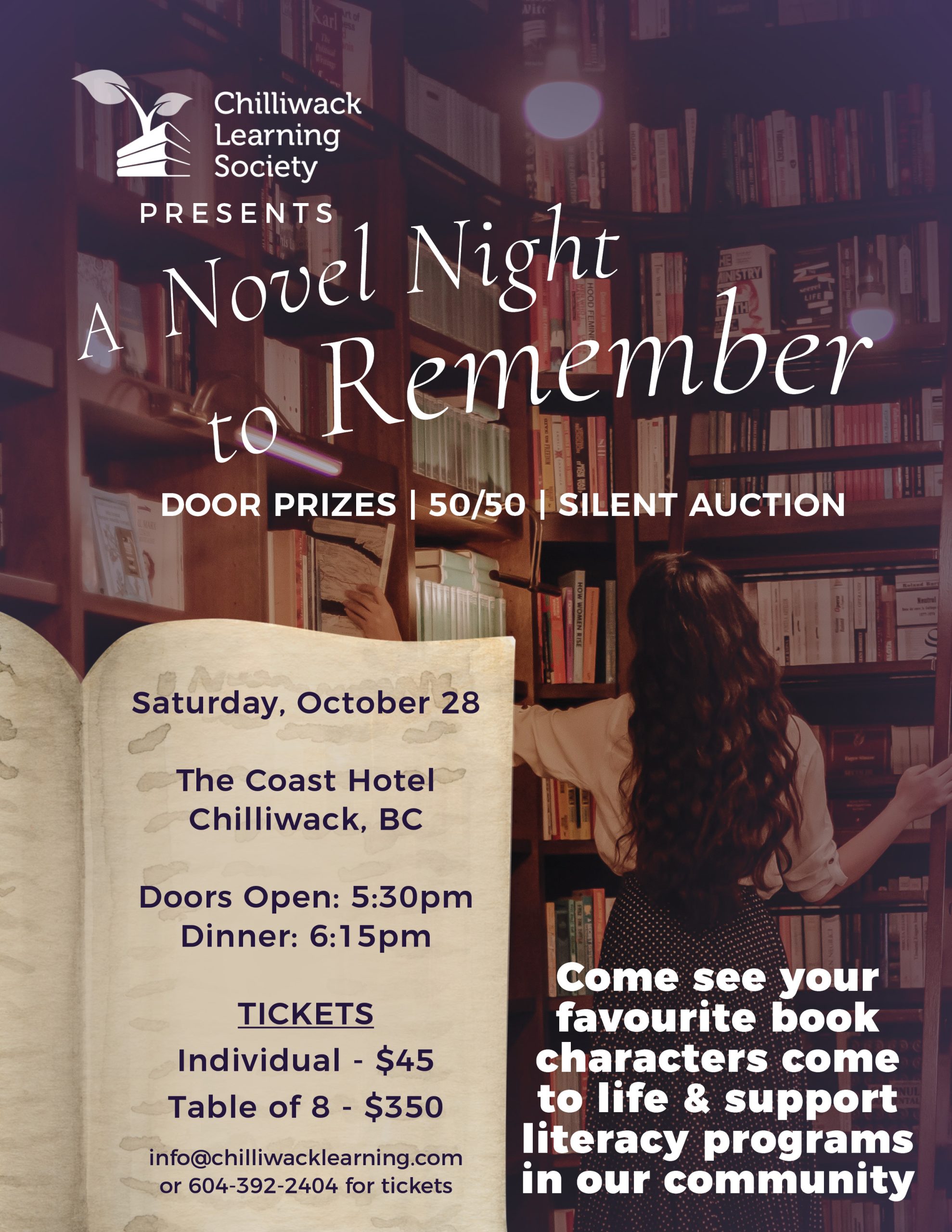 Coast Chilliwack Hotel by APA 45920 First Avenue, Chilliwack, BC, CanadaOn October 5, we will host “A Novel Night to Remember” fundraiser at the Coast Chilliwack Hotel. Proceeds support local literacy programs, including English language support for newcomers, tutoring for...